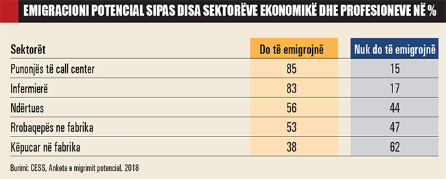 Anketa mbi potencialet e emigrimit gjeti se punonjësit e call center, që përgjithësisht janë me universitet ose vazhdojnë studimet dhe përgjithësisht zotërojnë një gjuhë të huaj, duan të ikin. 85% e të anketuarve në këtë sektor pohuan se duan të ikin. Gjithashtu 75% e infermierëve, 56% e punonjësve në sektorin e ndërtimit duan të ikin, 53% e rrobaqepësve dhe 38% e tyre që punojnë në fabrikat e këpucëve.