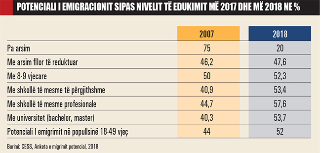 Në vitin 2007, rreth 40% e personave me arsim të lartë donin të largoheshin nga vendi. Në vitin 2018, kjo tendencë është rritur me 13 pikë përqindje, pasi 53.7% e personave me arsim të lartë kanë pohuar se po planifikojnë të largohen nga vendi. Dekadën e fundit ka një lidhje më të fortë midis edukimit dhe dëshirës për emigrim. Të dhënat e anketës sonë tregojnë se migrimi potencial është më i lartë për personat me edukim profesional, terciar dhe sekondar. Ky fakt, nga njëra anë, shpjegohet me mundësitë më të mëdha të punësimit në Gjermani, në vendet e zhvilluara të BE dhe në Amerikën e Veriut. Në kushtet kur konkurrenca globale po rritet, vendet e zhvilluara rrisin gjithnjë e më shumë kërkesën për persona të kualifikuar. Këtij interesi i përgjigjet pakënaqësia, mundësitë e pakta dhe kushtet e punës në Shqipëri.
