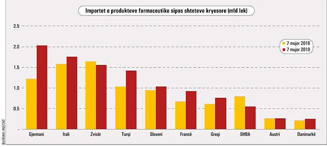 Gjatë 7 muajve të 2019, importet e mallrave u rritën në total me 8%, ndërsa produktet farmaceutike shënuan rritje në sasi me 21%. Rritja do të ishte e dobishme për produkte të tjera, por në rastin e medikamenteve, ku Shqipëria radhitet në vendet me konsumin më të lartë të antibiotikëve në rang europian, tendenca zgjeruese po nxjerr zbuluar problemin që kapitali human po kalon me shëndetin. Shpenzimet për medikamente po rriten me shpejtësi, duke lajmëruar kosto të reja për Shqipërinë, e cila me termat aktualë të zhvillimit dhe fondet e ulëta që akordon për shëndetësinë nuk jep shpresa për zbutjen e pasojave.