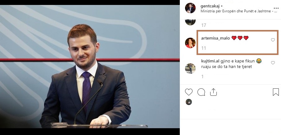 Përveç komenteve dhe pëlqimeve nga personazhe të njohur të shoëbizit shqiptar, ajo që bie në sy është komenti i zëvendës ministres së Jashtme Artemisa Malo.