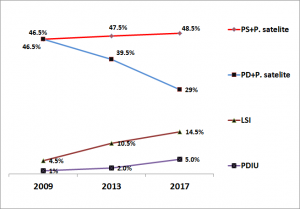 Sidoqoftë, pesha elektorale e PS-së (me partitë satelite të saj, PSD, PDS etj.) ka mbetur mbetur stabël – 46.5% më 2009, 47.5% më 2013 dhe 48.5% më 2017.